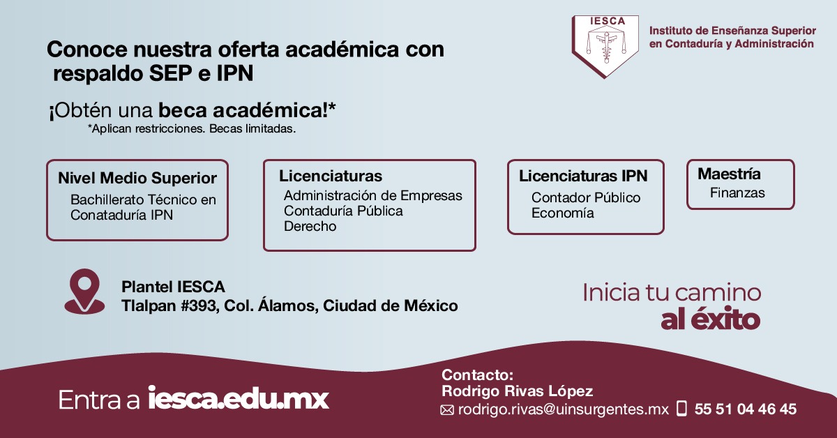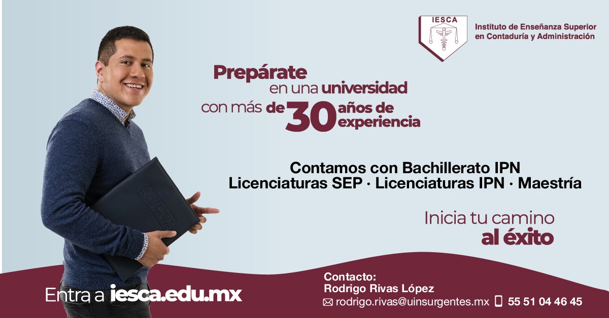 Al Instituto de Enseñanza Superior en Contaduría y Administración, IESCA (por sus siglas), le respaldan 30 años formando en sus aulas a Licenciados en: Contaduría, Administración de Empresas, Informática, Derecho y Bachilleres que son nuestro orgullo. Por su preparación y mentalidad de triunfadores leales y comprometidos, laboran tanto en la iniciativa privada como en el sector público. Ofrecemos carreras con plan cuatrimestral (tres años y cuatro meses) con incorporación a la SEP. plan semestral (cuatro años) con incorporación al IPN y nuestro Bachillerato Técnico incorporado al IPN que prepara jóvenes adolescentes para que desde temprana edad puedan ser útiles a la sociedad en el área de contabilidad. Con un compromiso de estar presentes en los foros académicos, que nos permitan estar a la vanguardia en la dinámica educativa referente a los temas de educación media y superior, hemos firmado un convenio de colaboración con la Alianza para la Educación Superior (ALPES).